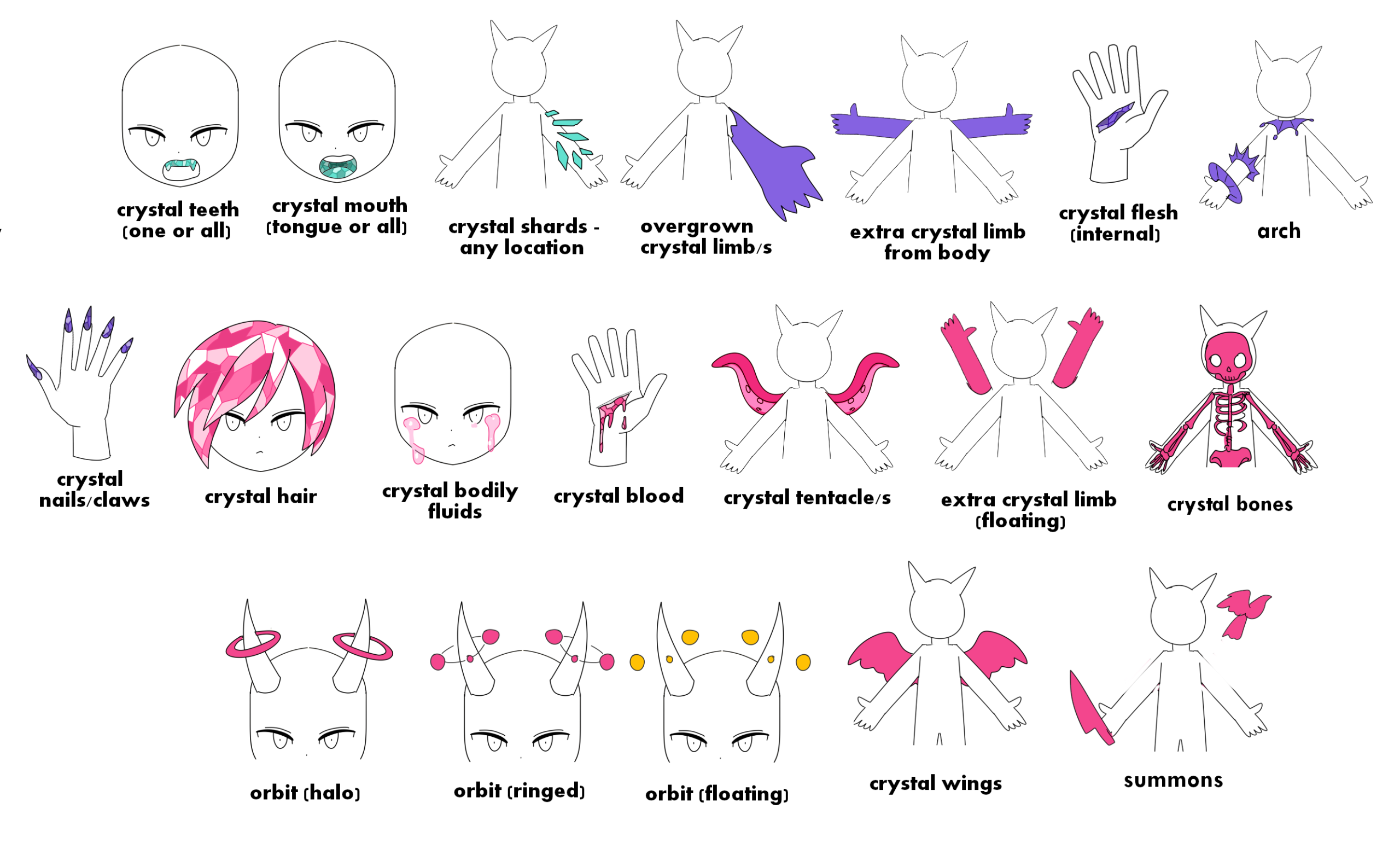 additional crystal limbs (including floating ones) may be arms or legs, and the original arms or legs do not need to be crystallized for them to have this trait.crystal wings may be of any sort, including bird, bat, butterfly etc.orbit and floating orbit pieces may be anything, including planetoids, flowers, small items etc.crystalkers with the twinning trait must have the same horns.