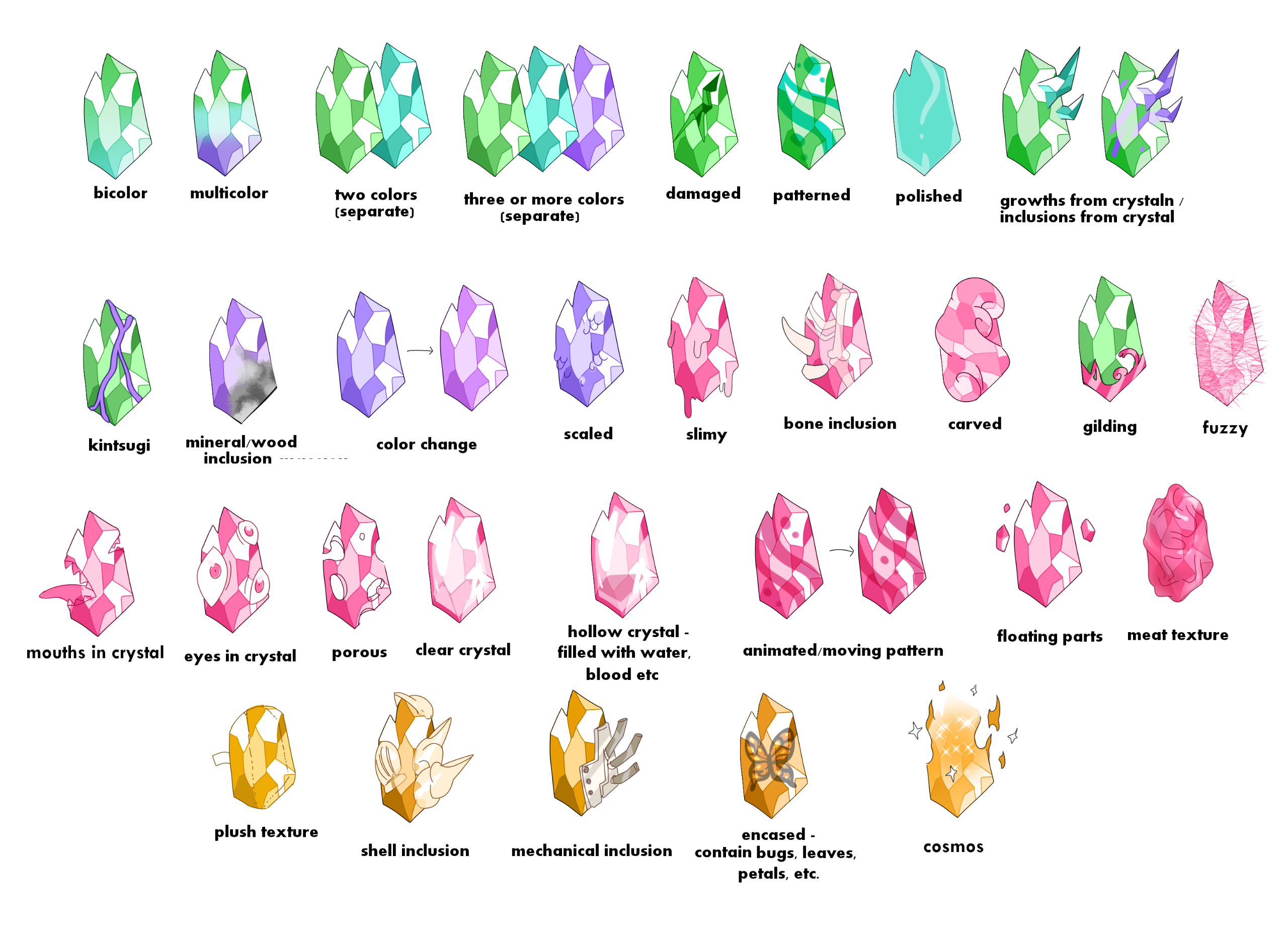 there is no limit to what colors or patterns you can use for your crystalker's crystal.different parts of crystal may be different colors from each other eg. like the patches of a calico.crystal is bicolor or more if the hues are too different from each other to be viewed as one.patterns must not resemble encased objects or give the illusion of such.hollow and encased crystal may contain anything non-living.